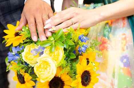 今回おふたりの結婚式の季節が8月ということで夏らしい内容で検討されておりました。 新婦様はひまわりがお好きということでお花には夏を感じるひまわりを使いブーケに夏らしさを取り入れました。 またおふたりには打ち合わせが始まる前にお子様が生まれると言うおめでたいこともあり、親子三人での結婚式が出来ればということで薦めていきました。