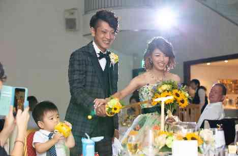 披露宴ではおふたりのメインテーブルにひまわりを使い夏らしさを出したコーディネートにしました。 またゲストの皆様に日頃の感謝を込めて多くの人に御礼を言えるようなキャンドルサービス等を取り入れまわっていきました。