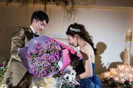 打ち合せの際に新郎様から新婦様へのサプライズを考えています。との事で喜んでご協力させて頂きました。当日は新婦様の職場の方、お二人の共通の方からのサプライズDVDを上映、新婦様が驚かれた最後の締めくくりで、新郎様の登場!新婦様が大好きな「コスモス」の花束とOpen When Letterのプレゼント! ゲストの皆様からは暖かい拍手が起こりました。