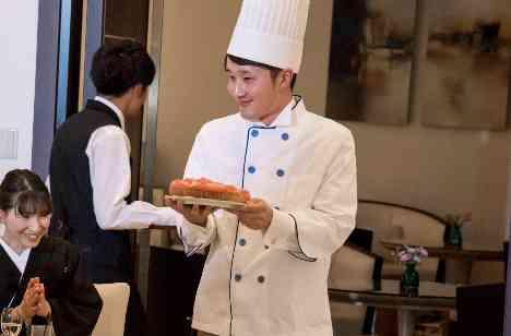披露宴のデザートタイム時に、新郎新婦様よりゲストの皆様へのケーキのおもてなし! 新郎様がラ・メゾンSuiteのパティシエになりきり、ケーキを会場のショーケースに! お二人からゲストの皆様に取り分けて頂きました。