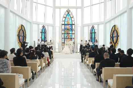 お二人と参列された方々を包むように四方には、神秘的なステンドグラスが輝く純白のチャペル。聖歌隊・オルガニスト・フルート奏者・バイオリニストの生歌生演奏がチャペルに響き渡る中、お二人の誓いが結ばれました。