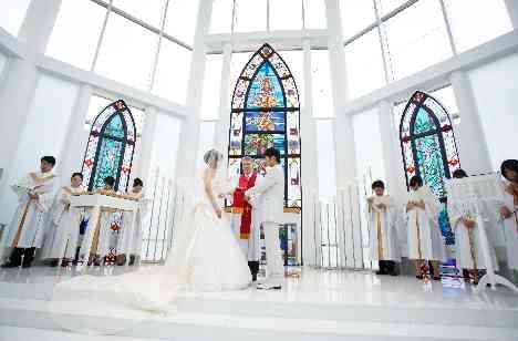 挙式は、播磨地域の中で最大級の純白のチャペル“セント・ルーチェ”で行われました。聖歌隊・オルガニスト・バイオリニスト・フルート奏者の生歌生演奏で多くのゲストの方が感動される中、光り輝くステンドグラスの前でお二人の愛の誓いが結ばれました。