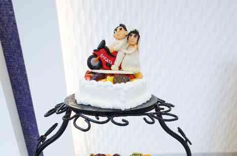 ケーキカットには、結婚したお二人が最初に行う、共同作業であり、結婚をお祝いしてくれるゲストの皆様への幸せのお裾分けという意味が込められており、結婚式当日は、お二人をイメージして作成したマジパンが登場!新婦様からこっそりとお写真をお借りして、新郎様の愛車にお二人が乗っているように作りました。