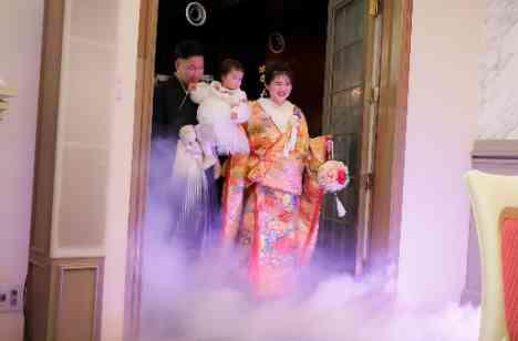 お色直し後の再入場は 和装・・・! シックな雰囲気の紋付袴と 華やかな格式高い色打掛をまとい おふたりは装い新たに皆様のもとへ 新郎様の腕の中にはもりろんおふたりの 大切なお嬢様が・・・ おふたりとお子様を包み込む スモークマシンの入場パフォーマンスで 披露宴会場は大盛り上がりでした💛
