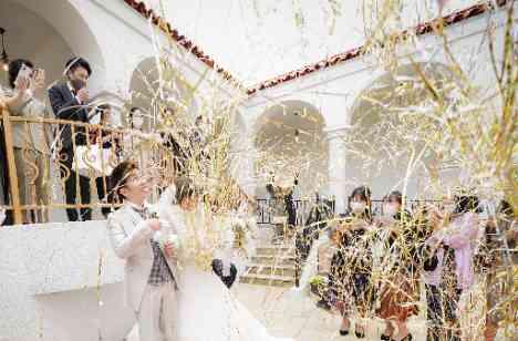 皆様の前で愛を誓われたおふたりは、挙式後。 祝福のフラワーシャワーでの退場。 そしてご友人様による巨大クラッカー発射!! ゲストの皆様も巨大クラッカーの迫力に大盛りあがり! 挙式での感動をそのままにバルーンリリースを 全員で楽しまれゲストの皆様から自然と笑顔が溢れる楽しいひとときとなりました。