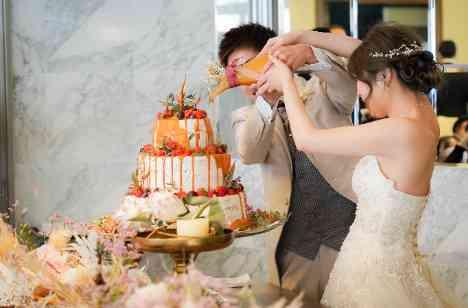 実は、最近一番注目されている新しいウェディングケーキの演出の一つ”カラードリップケーキ”ケーキに新郎新婦のおふたりがソースをかけ、オリジナルウェディングケーキが完成します! ゲストの皆様の目の前で行われるセレモニー ということと、おしゃれな見た目の変化が魅力的です。 担当プランナーのアイデアと新婦様のこだわりから最高にかわいくおしゃれなケーキが出来上がりました!