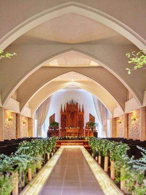 厳かな雰囲気漂う祭壇が映える、明るい雰囲気のチャペルも人気です。バージンロードにグリーンを添えるとナチュラルな印象に様変わり。
