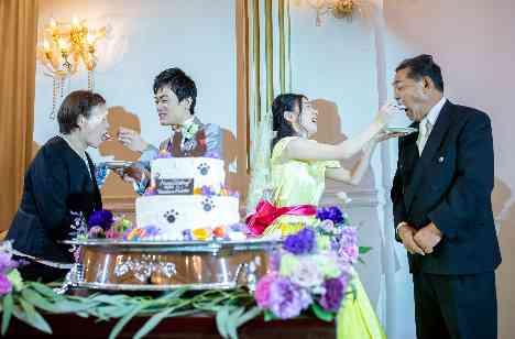 お打合せ時からゲストへのおもてなし・感謝を伝えたいと仰っていたおふたり。ファーストバイト後には、ご親族様への《サンクスバイト》をサプライズでご用意しました!ゲストが参加し、ご親族様へのサンクスバイトに「あ~ん!!」とお声掛けもばっちり!サプライズでお呼び出しされたご親族も最初は照れくさい表情でしたが、サンクスバイト後は皆様満面の笑みでした★
