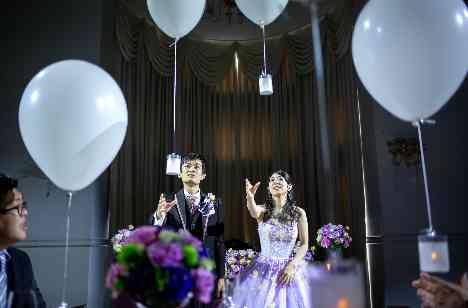 メインカラーの紫を使った披露宴会場では幻想的な演出をおふたりがご用意♪お色直し入場後、ゲストのテーブルに配られたバルーン付きのキャンドルを同時に天井へと飛ばします♪ゲスト参加型のため、会場が一体となって作り上げた演出となりました!おふたりもお打合せから楽しみにされており、素敵な笑顔もお写真で撮影することができました★