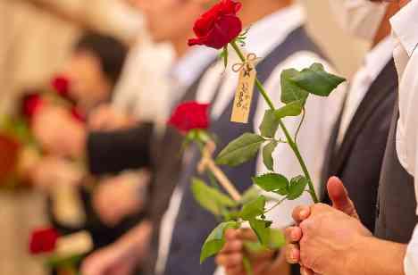 新郎様のお繋がりのあるゲスト様がそれぞれ意味が違うバラをもち、新郎様が入場後ひとつひとつしっかり受け取り2階で待つ新婦様のもとへ歩き出しました。お色直しを終えた新婦様の待つ2階のドアを開ける際にはインターホンの音を出したりなど、おふたりらしさを欠けることなく盛り上がることができたダーズンローズセレモニーでした。