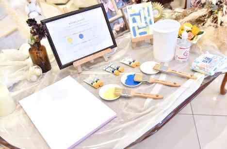 真っ白のキャンバスをご用意し、ゲストの皆様と一緒に結婚証明書を創っていく演出。1本1本線を描くことで出来上がる、唯一無二の世界にひとつだけの結婚証明書なので、挙式までお二人もワクワクしていました!素敵なアートとして、ずっとおふたりのご新居に飾ることができる記念品なので、見るたびに結婚式のことを思い返せる素敵なものが仕上がりました。