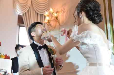 ご延期される前からこだわりのケーキデザインをご指示くださっていたおふたり!打合せが再スタートされてからも『このデザインで!』と、当日のケーキを楽しみにされていました♪ 最初の一口を食べさせ合うファーストバイトでは、大きなスプーンで新郎様に食べさせてあげる新婦様と、大きな一口を頬張る新郎様!口の周りにたくさんクリームがつきましたが、ゲストの皆様は『シャッターチャンス!』と大盛り上がりとなりました♪