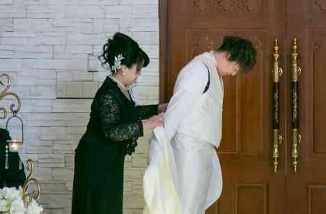 挙式の始まりは新郎様のお母様にお手伝いいただき、ジャケットセレモニーを。お母様から新郎様にジャケットを着せ、新郎様を送り出す身支度をしていただきます。お支度が結び、バージンロードを歩きだす新郎様を見つめるお母様の表情はとても優しく、そんな家族の絆を感じさせる瞬間を、ゲストの皆様もあたたかく見守ってくださりました。
