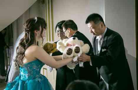 披露宴のフィナーレで新婦様がお手紙を読まれた後に、おふたりから親御様へ渡された記念品はウェイトベア。新郎様と新婦様が産まれたときの体重と同じように作られたぬいぐるみを、その手にしっかりと受け取ったお母様から懐かしむような笑みがこぼれます。ウェイトベアを通じて、これまで大切に育ててくれたことへの親御様への感謝をお伝えになりました。