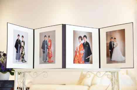 大切なゲストを招待するのに、負担がかからない時間帯が選べることと、ゆっくり1日を過ごしてもらえるように、式当日の会場は貸切にしてもらいました。待合いのロビーでは前撮り写真を飾りゲストをお迎えしました。会場までのアクセスも良かったのでゲストには喜んでもらえました。