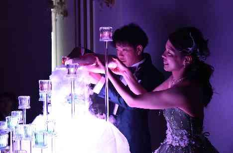 披露宴ではお料理に拘り、新婦様のお色直しカラードレスの色当てクイズを行ったりと、とにかくゲストへのおもてなしを重視してきた新郎新婦様。披露宴終盤では光と水の演出を行い、会場内が沸き立つ一面もありました!