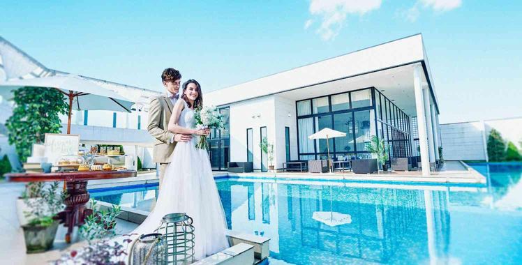 白を基調としたパーティ会場は、三面の大きな窓から自然光がたっぷりと差し込む開放的な空間。プール付きのテラスと自由に行き来できる造りで、デザートビュッフェやガーデン演出など、ふたりらしいおもてなしが叶います。貸切だからこそ実現できる、時間や空間に縛られない自