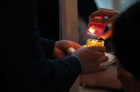 おふたりはこだわりのカラードレスとタキシードにお色直し!ゲスト様のテーブルにはカラフルなキャンドルが★お色直し入場後、おふたりのキャンドルからゲストのキャンドルへと火が灯され会場中が幻想的なキャンドルに包まれました。ゲストとおふたりが一斉にキャンドルの蓋を閉じると、火に反応した蓋からおふたりからの文字が浮かび上がりました!ゲストそれぞれに向けたサプライズメッセージに皆様驚きと感動でした♪