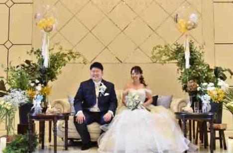 お二人のこだわりのひとつのメインソファー! ゲストの皆様もおふたりの周りに集まってくださりたくさんお写真を残してくださいました。テーマに合わせてイエローのバルーンも合わせ、会場のトータルコーディネイトもとても華やかになりました!専属のフローリストとのお打合せも楽しく進んでいき、楽しいお打合せでございました!
