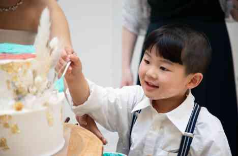 披露宴でもゲストの皆様と一緒に楽しむ演出がいくつもありました。 特にウェディングケーキに皆様でペイントする「ペイントケーキ」を行いました。 ゲストの皆様と一緒に作る世界で1つだけのオリジナルケーキです! その他にも中座のエスコート役をサプライズで抽選で行うなどゲストの皆様が楽しめるように沢山工夫をされていました。
