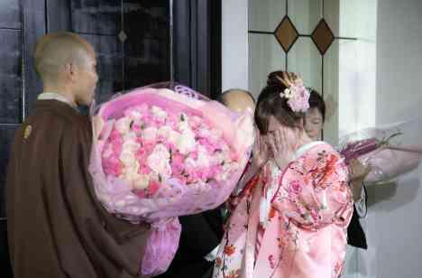 新郎様から新婦様に向けて素敵なサプライズが!まずはチャペルにて「あなたの思いやりに感謝します」という意味が込められた8本のピンクのバラをお渡し。そして、ご披露宴の結びには「100%の愛情」という意味が込められた、100本のバラとお手紙を!そして、2つの花束を合わせると「永遠」を意味する108本のバラが完成します。メッセージ性あるサプライズに、新婦様の目からは感動の涙がこぼれました。