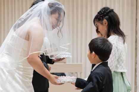 挙式では多くのお子様ゲストがお手伝いを…♡まず新婦様の入場シーンでは、ドレスのトレーンを持つトレーンキッズ達が登場。そして指輪交換のシーンでは、新郎様と新婦様それぞれの指輪をおふたりのもとに届けるためリングキッズ達がしっかりとした足取りでバージンロードを歩きます。お子様が登場するたびに見守る方々からも自然と優しい笑みがこぼれ、新郎新婦様を包みこむ空気がとても和やかであたたかい空間となりました。