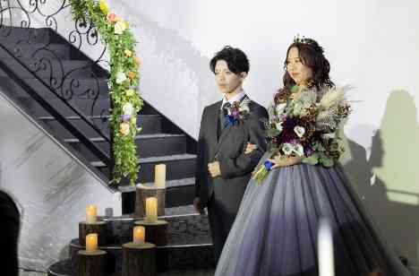 披露宴でのお色直しの入場は新郎様と新婦様で別の場所から入場を。新郎様が大きな窓ガラスの扉から入場し、新婦様が大階段の上から入場されました。そして新婦様の好きな曲に合わせ、新郎様がゆっくりと新婦様が持つ大階段の上まで迎えに行く演出は、見学の時から新婦様がやりたいとおっしゃっていたこだわりのシーン。結婚式の夢のひとつを叶えられたお色直しの入場は、その世界観に引き込まれるロマンティックな場面でした。