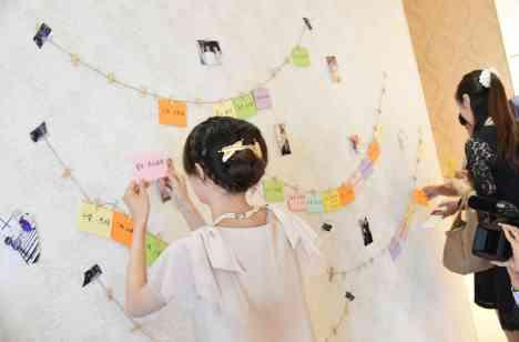 ゲストが会場に着いてから待っている間、楽しんでもらえるように待合いのロビーの壁一面にいっぱいの装飾を施し、私達の写真も貼り付けました。友人達が飾りを使って写真をいっぱい撮って楽しんでくれていたので頑張ったかいがありました♪