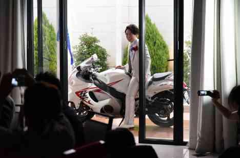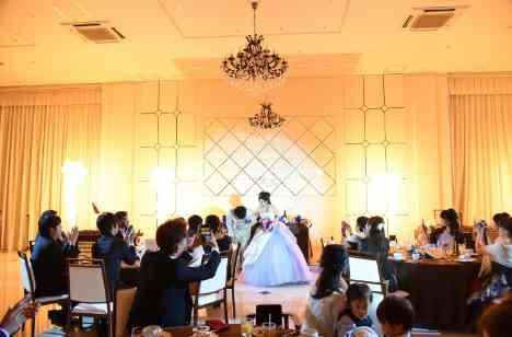 再入場は新郎は広いテラスからのバイク入場を行いました。サプライズだったのでカーテンがあいて新郎がバイクで登場した時は盛り上がりましたし、炎を上げる演出も行ったので、とても盛り上がり写真もいっぱい撮ってもらえました。新郎も大満足でした。