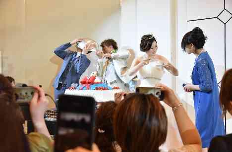 結婚式は定番のファーストバイト。でもゲストにも振舞いたい気持ちもあり、2名を選抜されゲストバイトを行いました。新郎様にはとても大きな大きなビックスプーンでおもてなし!新郎新婦様のアルバイト時代にお世話になった方ということもあり、笑いも交えたサプライズ演出でした☆