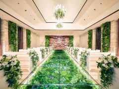 グリーンのバージンロードが魅力の新チャペルは、北関東でも希少なトレンド感溢れたオリジナルの空間。木目調の優しい雰囲気がよりアットホームなセレモニーを彩ります。