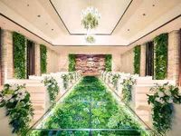 温もりと自然に溢れたグリーンバージンロードには、お花と緑が敷き詰められています。おふたりの想いやメッセージを載せたアイルランナーを敷いてオリジナリティを出すことも◎ ランウェイのように高さのあるバージンロードはドレス姿も美しく映えます。