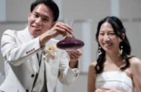 王道のウエディングケーキ以外で共同作業をしたいと思い、「カクテルブレンディング」を行いました。 白ワインにカクテルを注ぐ演出で、その後はそのままドリンクとして楽しんでいただけるため、私たちを含めお酒好きなゲストにも喜んでもらえ、一石二鳥の演出になりました。少し珍しい演出だったと思いますが、会場が一体となって楽しめる時間になり、ゲストも印象に残ったようで、たくさん感想をもらいました。