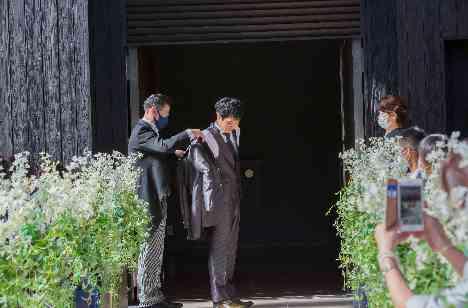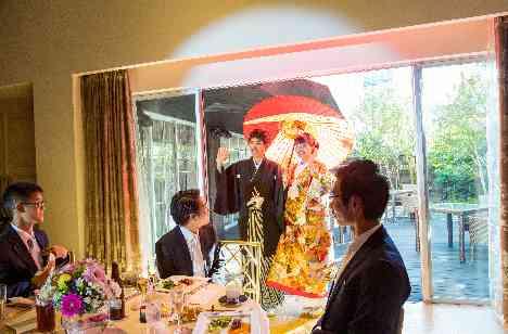 両親も挙式に参加してもらうという形式で ジャケットを父に、白手袋を母に渡してもらい新郎入場を行いました。 新婦入場前のベールダウンをスクリーン越しで行いました。スクリーン越しのベールダウンは朱雀邸ならではの演出です。