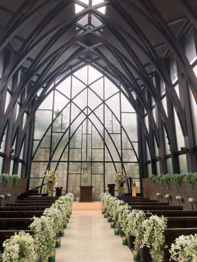 チャペルは温かみのある自然光と緑が包み込む空間で、ドレスの美しさが際立つ、心地よい雰囲気のチャペルでした。