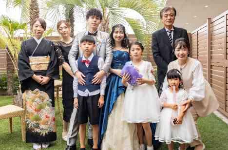 おふたりで中座された後、新婦様はカラードレスを身にまといお色直し入場をされました。ご披露宴会場のプルメリアのガーデンにて皆様とのお写真を残しました。ご家族様のみだからこそゲスト全員とのお写真を撮影することができ、おふたりの笑顔はもちろんゲストの皆様との笑顔が輝くとても素敵なお写真を残すことができました。