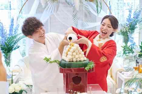 ご披露宴での一大イベントのケーキセレモニーを和装で行うおふたり。そんなおふたりにぴったりなもの、みたらし団子ドリップをご用意!みたらし団子のタワーを作り、そちらにみたらし団子のタレをドリップ。そしてファーストバイトでは串刺しのお団子をパクリ!一風かわったファーストセレモニーですが、おふたりらしい素敵なシーンとなりました。