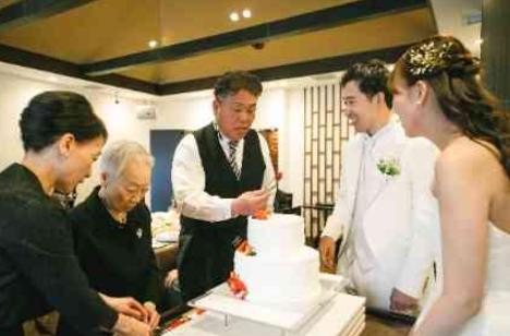 おふたりの前にご用意されたウエディングケーキは、まだ未完成のもの。ご披露宴の中でゲスト全員にご登場いただき、ケーキデコレーションの仕上げを行っていただきました。お打合せの際にゲスト全員が参加できるなにかを…と考えられ決まったこのアイデア!一生に一度のこの日に、世界でたった1つのスペシャルウエディングケーキが完成しました♡