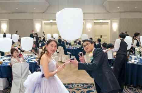 クラウンボールルームはとても広く、天井も高いため、開放感があります。 テーブルは12卓でしたが、テーブルの間隔も広く取ることができました。 また、お色直し後にランタンセレモニーをしましたが、セレモニー後も手紙朗読やエンドロールで暗転するたびに、ほわっと明るいランタンが浮いていて、とても幻想的でした。
