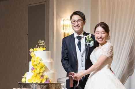 式場選びの一番の決め手が料理だったので、コースもお任せで良いかなと思っていましたが、シェフとの打ち合わせでいろいろな提案をしていただきました。そしてその結果、私の地元の食材を使ったデザートや、テーマのラプンツェルに寄せたお料理を取り入れたオリジナルコースになりました。 3段のケーキに、ラプンツェルの髪の毛をイメージした黄色いお花で飾りつけてもらいました。