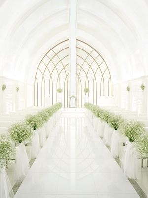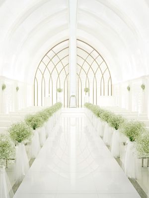 おふたりのイメージに合わせて自在にアレンジ可能!純白の大理石で作られたバージンロードの上には光のクロスが。思わず息を飲む圧巻のウエディングステージ