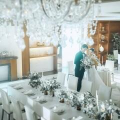 【最大150名◎2つの会場から選べる】シンプルな色味にシャンデリアが煌めく上質会場。オープンキッチン×緑に包まれたナチュラルな白基調の会場から選べる!共にフロア貸切のゆとりある空間でゲストと和やかな1日を
