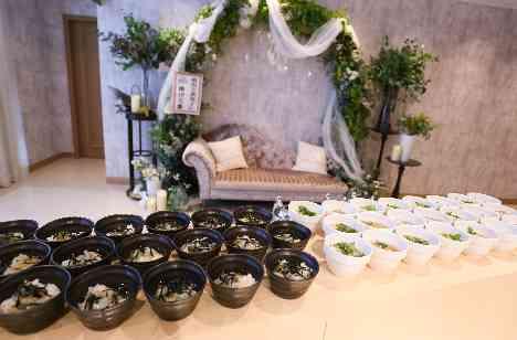 お二人が一番楽しみにしていた”お茶漬けビュッフェ” お打ち合わせがはじまった当初から「やりたい!」とおっしゃっていたお二人。ゲストの皆様もその時はお席を立ってお二人と楽しんでお楽しみいただけておりました! 皆様のその表情を見てお二人も「やってよかった!」とおっしゃってくださいました♡ 皆様にはフルコースの最後の〆でお召し上がりいただきました♪
