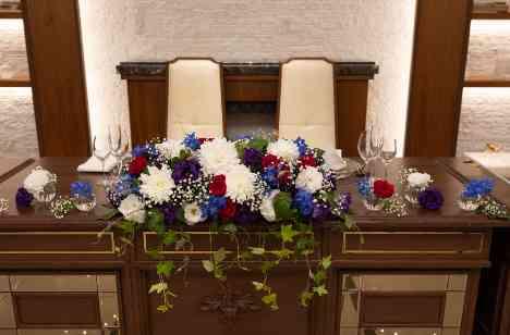 新郎様は某アメリカンスーパーヒーローたちが大好き!そんなヒーローたちを色で表現することになりました!カラードレスが赤だとスタイリストから聞いたフローリストは、赤ばかりを使うのではなく、あえて青いバラや白いお花を使うことでインパクトを出すことに。新婦様のご衣裳にも映えるようなお花をチョイスし、新郎様の大好きなお色味に揃えてコーディネートされました♪