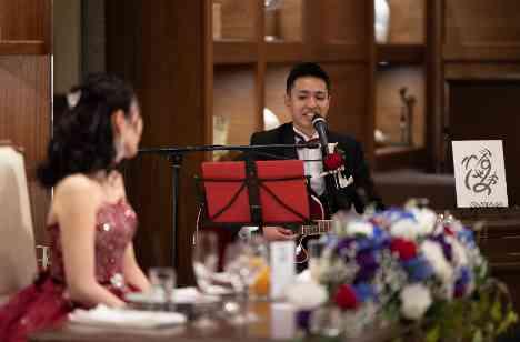 新郎様より新婦様へサプライズをご用意!その名も、愛を込めて歌声をお届け!突如ギターを片手にマイクに向かう新郎様のお姿を見て新婦様も驚きの表情♡素敵な歌声と愛のこもったメッセージを届けられた時には、瞳に涙が。。。新郎様の粋なサプライズに会場も幸せいっぱい、愛がいっぱいのハートフルな時間が流れていました♪