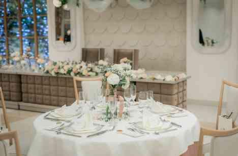 白を基調としたヨーロピアンクリスタルの雰囲気に合わせて、トレンドのくすみカラーを取り入れたコーディネート!! 会場専属のフローリストがお二人のイメージしている画像に合わせてご提案! 2wayのウェディングドレスをお選びになったご新婦様♡挙式からイメージチェンジした後の披露宴入場はとっても盛り」上がりました!
