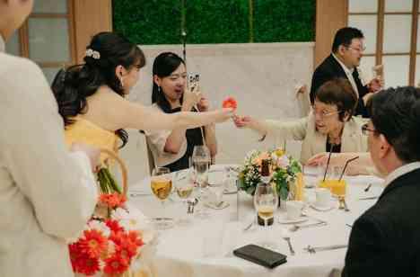 お色直し再入場後、お二人のラウンドテーブルがスタート☆ そして、お二人から感謝の気持ちを込めて、フラワーサーブの演出がおこなわれました。 ひとりひとりに1輪のガーベラを想いを込めてお渡ししていくお二人。 歓談や各卓でのお写真も楽しまれ、皆様自然と笑顔が溢れます♡ 和やかな雰囲気でパーティは進んでいきました。