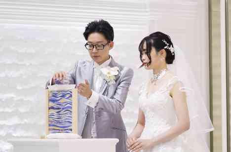 お二人が結婚証明書に選ばれたのはサンドアート。ゲスト参加型の思い出に残る素敵な演出の1つです☆ 受付にてゲストの皆様にお好きな色の砂を入れていただき、仕上げはお式にてお二人が☆ゲストと一緒に作った世界でたった一つのサンドアート。皆様の想いが込められた結婚証明書は、素敵なかたちとなりお二人の一生の大切な宝物となりました♡