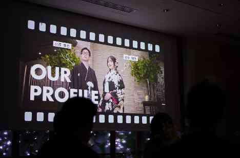 お二人が中座後、スタートしたのはプロフィールDVD。 おもてなしの1つしてオリジナルの映像を作成したお二人☆ お二人が作られた映像に皆様、思い出話や笑顔を見せながら楽しんでおりました。 お二人の再入場までのお時間、ゆったりとお食事を楽しんだりと映像をみながら和やかな時間が過ぎていきました・・・♡