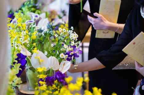パーティ会場入り口に準備された装花。フラワービュッフェで皆様にテーブルコーディネートをしていただくところからパーティはスタート☆ 会場に入る前にお好きなお花を手にとっていただき、皆様会場へ・・・。 集めたお花をテーブルに飾っていただき、各卓オリジナルテーブルコーディネートの完成です☆そして会場のコーディネートが完成したところでいよいよパーティのスタートとなりました♪♪